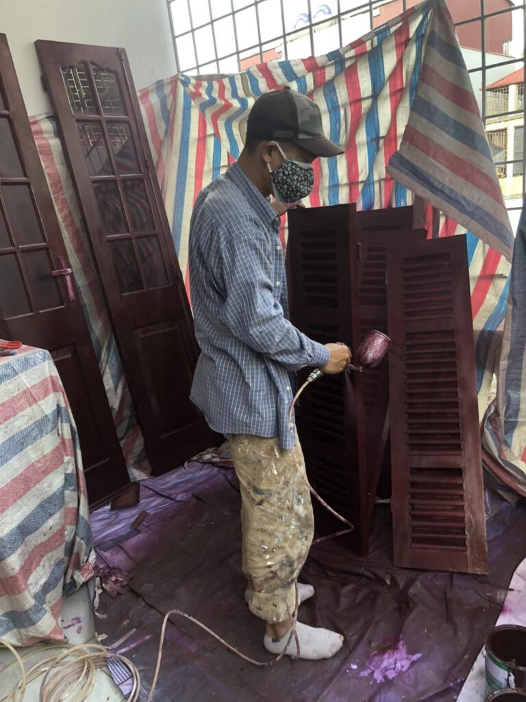Quy trình phun sơn được che chắn kỹ, bảo đảm không vương sơn lên tường, sàn hoặc đồ dùng xung quanh.